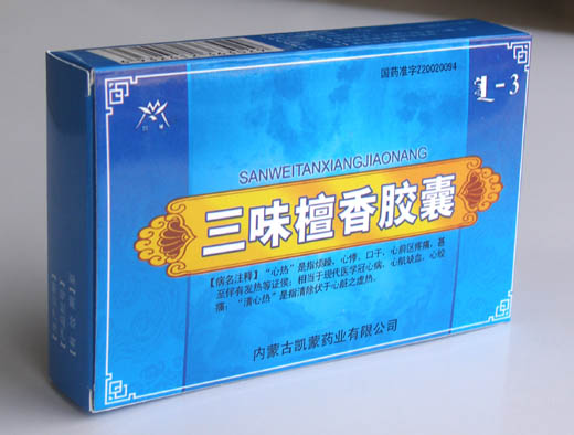 | 產(chǎn)品性能 | 清熱,用于清心熱。[成份]檀香、廣棗、肉豆蔻。 [性狀]本品內(nèi)容物為黃棕色粉末,氣香,味苦,微酸。 [功能主治]清熱,用于清心熱。 [規(guī)格]每粒裝0. 2g [用法用量]口服。- -次3粒,一日2次。四周為一個療程 [包 裝]鋁塑包裝0. 2g/粒X9粒/板X1板/盒;0.2g/粒X12粒/板X1板/盒; 0.2g/粒X9粒/板X2板/盒;0.2g/粒X12粒/板X2板/盒。 [批準(zhǔn)文號]國藥準(zhǔn)字Z20020094 [生產(chǎn)企業(yè)]內(nèi)蒙古凱蒙藥業(yè)有限公司 |