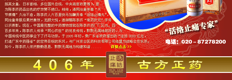2.老百姓都知道“痛則不通,通則不痛”,而一個(gè)藥品是否能夠真正能治好久治難愈、反復(fù)發(fā)作的各種風(fēng)濕痹痛,主要看該藥品是否真正能“活絡(luò)”,“活絡(luò)止痛丸”這一名字給人一種“似曾相識(shí)”的感覺(jué),加上“陳李濟(jì)”這個(gè)老品牌,只要經(jīng)銷商進(jìn)行適當(dāng)?shù)男麄鳎恍枰醋髂切╇x奇古怪的概念,消費(fèi)者都會(huì)排隊(duì)搶購(gòu)。