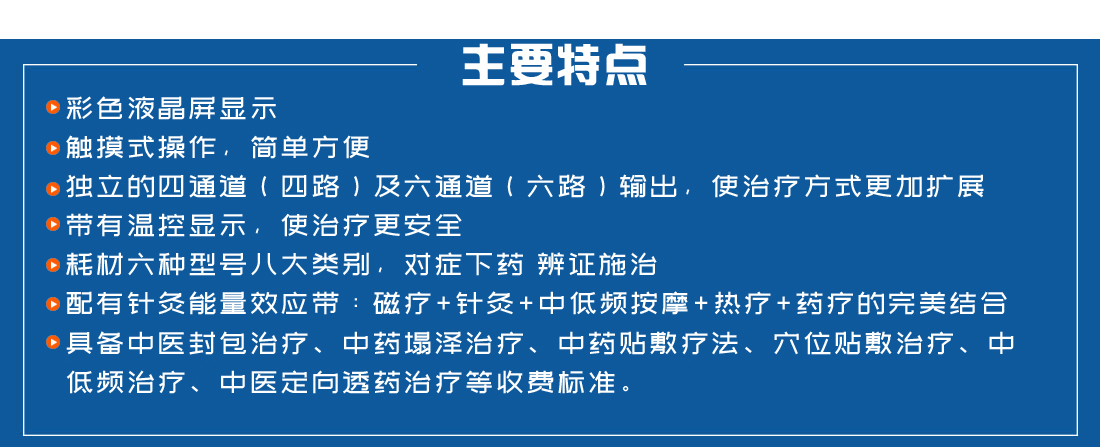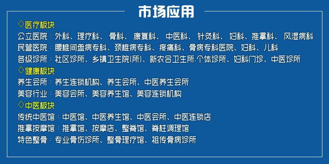按科室分:理療科 骨傷科 康復(fù)科 內(nèi)科 外科 婦科 兒科 按功能分:中藥治療康復(fù)設(shè)備/藥物治療儀 適合機構(gòu):醫(yī)院、社區(qū)醫(yī)療機構(gòu)、醫(yī)藥公司、藥店、美容機構(gòu)等 *列入國家中醫(yī)藥管理局“提升一批”項目;