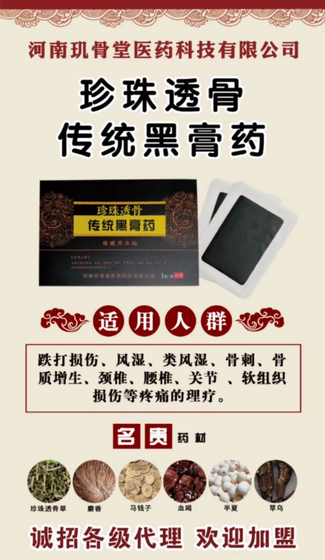 本產(chǎn)品將珍珠透骨草、麝香、馬錢子、川烏、草烏、血竭、半夏、桂枝、細(xì)辛、麻 黃、白附子粉碎成細(xì)粉,與黃丹、麻油混合加熱,加入麝香、乳香、沒藥、樟 腦混勻,攤涂在無紡布上、覆蓋離型紙、切片包裝而成的保健貼 |