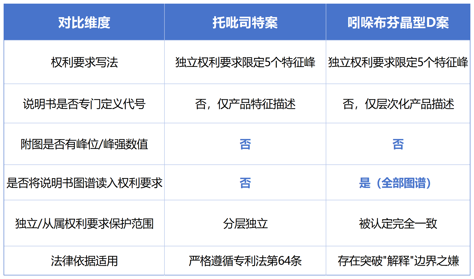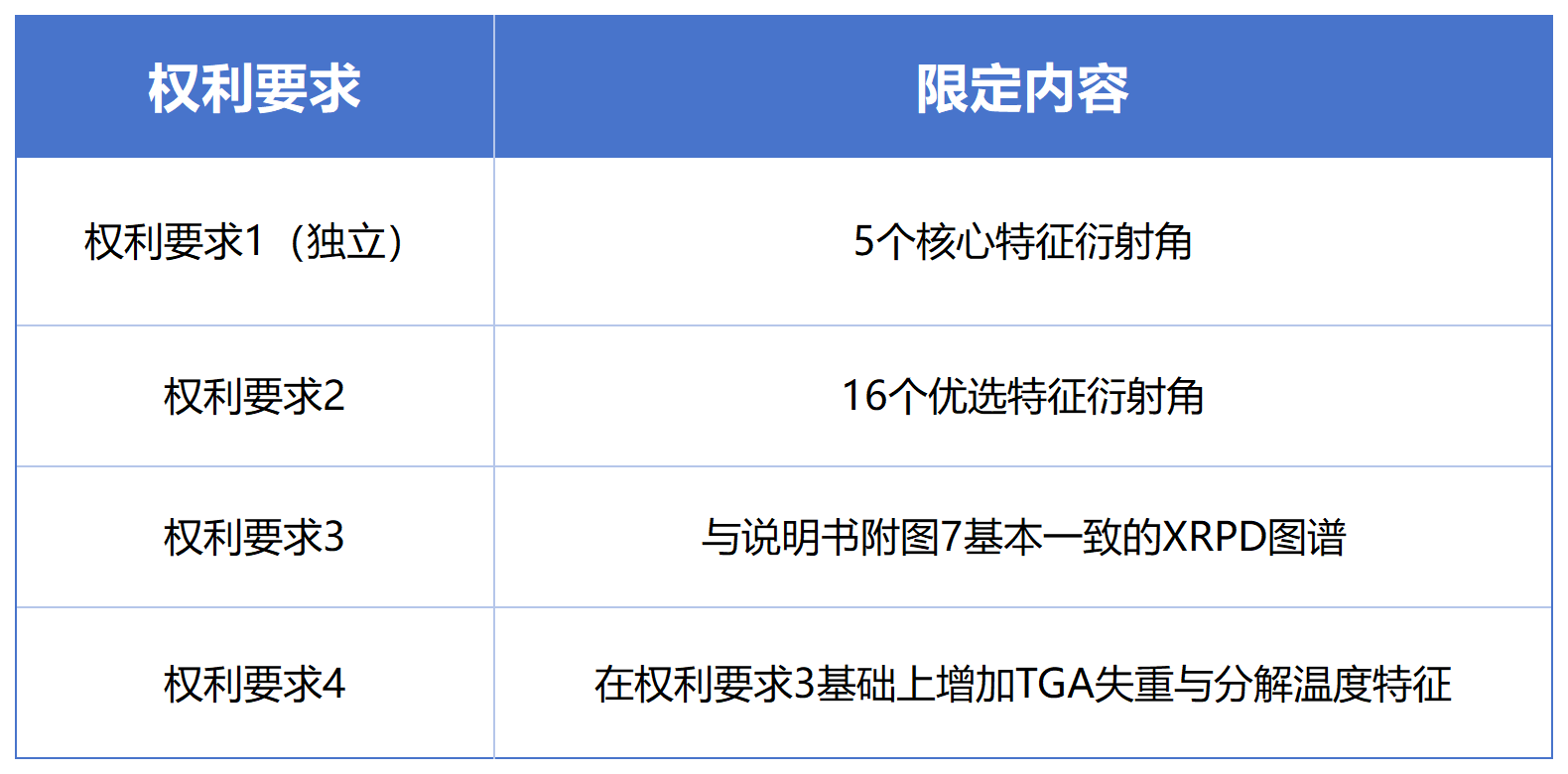 ——權(quán)利要求1(僅5個(gè)衍射角)和權(quán)利要求4(含TGA等多項(xiàng)參數(shù))的保護(hù)范圍被認(rèn)定完全一致。
